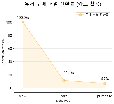 유저의 구매까지의 행동 과정을 (view ⮕ cart ⮕ purchase) 분석하기 앞서, 해당 이커머스의 전환율을 정의했습니다.