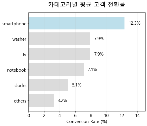 카테고리별 전환률을 먼저 살펴보면, 전자기기, 특히 'smartphone' 카테고리를 방문한 고객들이 실제 구매로 전환되는 비율이 12.3% 로 가장 높았습니다.