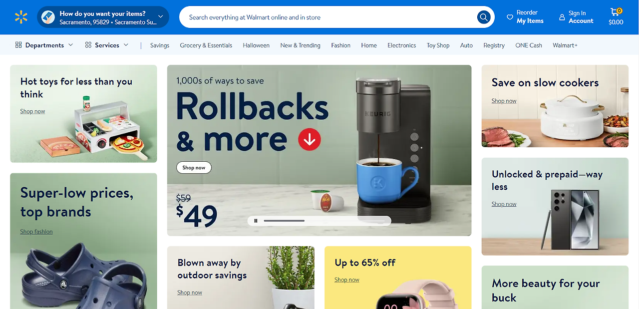 Wallmart 의 경우, 이커머스 메인페이지, 상품 카테고리별 메인페이지, 상품 카테고리 추천 랭킹 페이지, 상품 상세페이지, Cart 페이지, 구매/결제 페이지로 구성되어 있습니다.