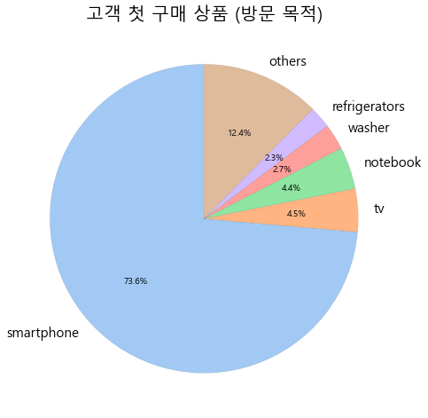 상품별 매출 비중과, 고객 첫 구매 상품(방문 목적) 매출 비중의 두 경우 모두, 70% 이상이 'Smartphone' 인 것을 확인할 수 있습니다. 이는, 해당 커머스의 주력 매출 상품이 'Smartphone' 이며, 고객들 역시 대부분 해당 커머스의 주력상품을 인지하고 있고, 이를 실제 구매할 목적으로 커머스를 방문하고있음을 의미합니다.
