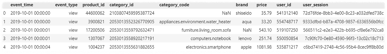 수집 데이터는 event_type 으로 view, cart, purchase 3개의 event 로그가 존재하는데, 이를 각각 Walmart 에 대입해, 상품 상세페이지 클릭(view), 카트 담기/찜 (cart), 최종 구매 확정 (purchase) 이후 각 이벤트 로그가 쌓이는것으로 가정했습니다.