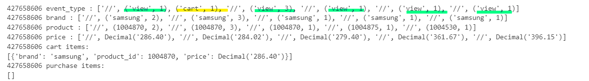 출력 결과는 예를들면, ''view ⮕ view ⮕ cart ⮕ cart ⮕ purchase' 로 이어지는 한 유저의 구매행동에서 연속된 동작을 묶는 방식으로 작동하는데, 대략 '[('view', 2), ('cart', 2), ('purchase', 1)]' 이런 식입니다. 또한, '//' 기호는 각 세션 단위의 이벤트들을 분리하기 위한 기호입니다. 이렇게 한 이유는, 길어지는 로그 이벤트 흐름을 좀 더 효율적으로 볼 수 있게 하기 위함입니다.