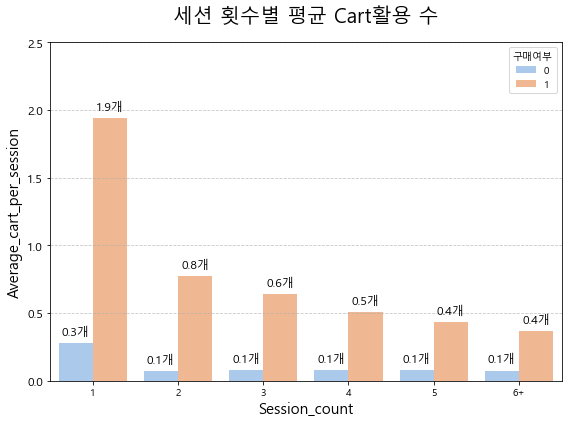 - 세션마다 Cart 를 1회 이상 활용하는 고객은 구매 확률이 높다.