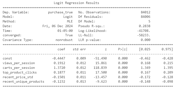 최종 변수로 선정된 아래와 같은 변수들은 모두 매우 높은 Z-score를 가지며, 구매에 유의미한 상관관계를 갖는 변수들로 판단됩니다. 특히 'cart_per_session'이 타 변수에 비해 계수값이 2배나 높게 측정되었는데, 즉 최근 고객이 세션마다 cart 를 이용하는 빈도가 증가한다면 이는 유의미한 구매 신호가 되는 셈입니다.