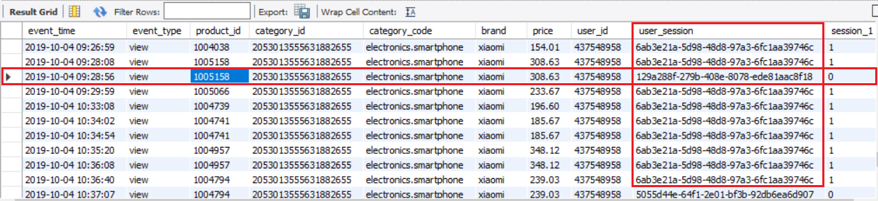 아래 SQL문의 결과와 같이 user_id 437548958 에 대해 약 1분 간격으로 event 가 발생했음에도, 9시 28분 56초 로그만 세션이 이상하게 배정되어있습니다. 또, 이와 반대로 세션 간격이 약 10시간 이상 차이나는데도 동일한 세션이 할당되어있는 경우도 있었습니다. (사실은 part2의 view_time 계산할때 이미 발견했었습니다.)
