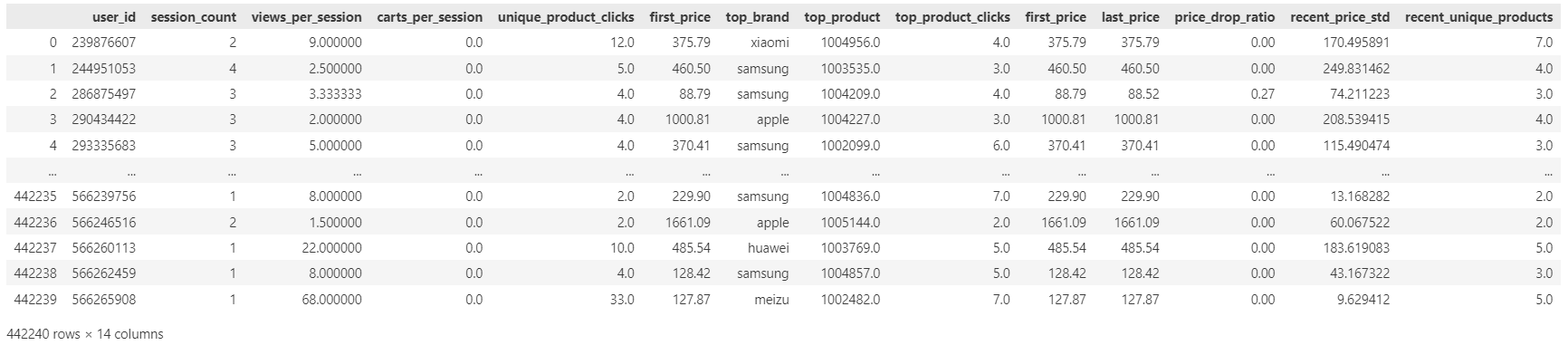 - top_brand / top_product : 유저가 가장 관심가진(이벤트를 가장 많이 발생시킨) 상품의 브랜드 / 상품 id
